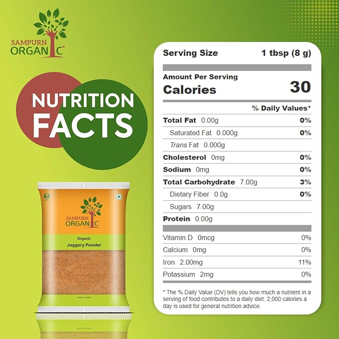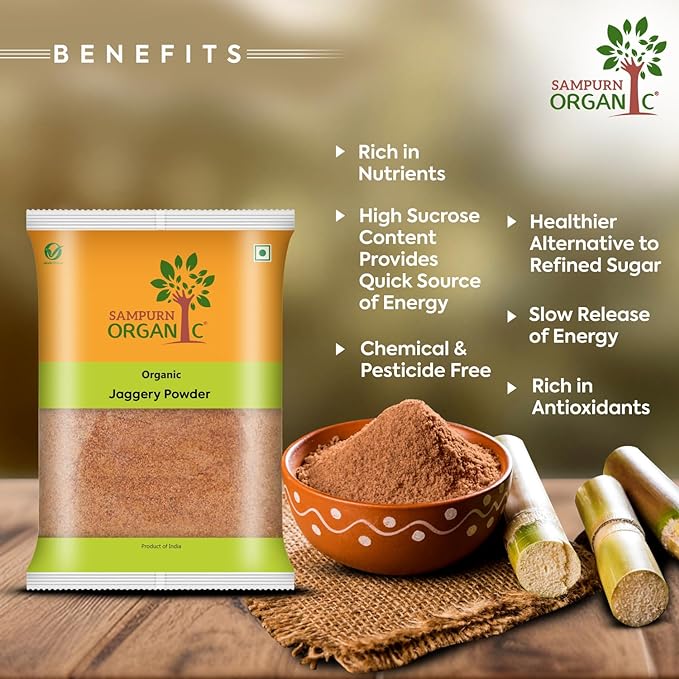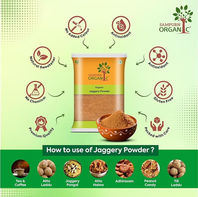 - Pure and Wholesome Sweetener: Our 100% organic jaggery powder is a natural sweetener that has been cultivated without the use of chemical fertilizers and pesticides. It is a healthier alternative to refined sugar and is derived from the concentrated sap of organically grown sugar cane or palm trees. With its rich, caramel-like flavor, it's a perfect way to add sweetness to your dishes without compromising on health.